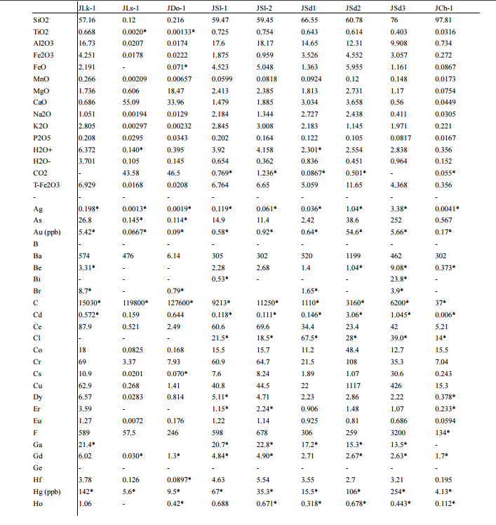 1996 recommended or preferable (with asterisks) values for major, minor and trace elements in five GSJ reference samples, (in % from SiO2 to T-Fe2O3 and μg g-1 from Ag to Zr, unless otherwise noted)